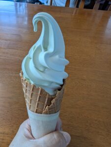 氷雪の門売店の「熊笹ソフトクリーム」写真はバニラとのミックス。これおいしい~~🤤